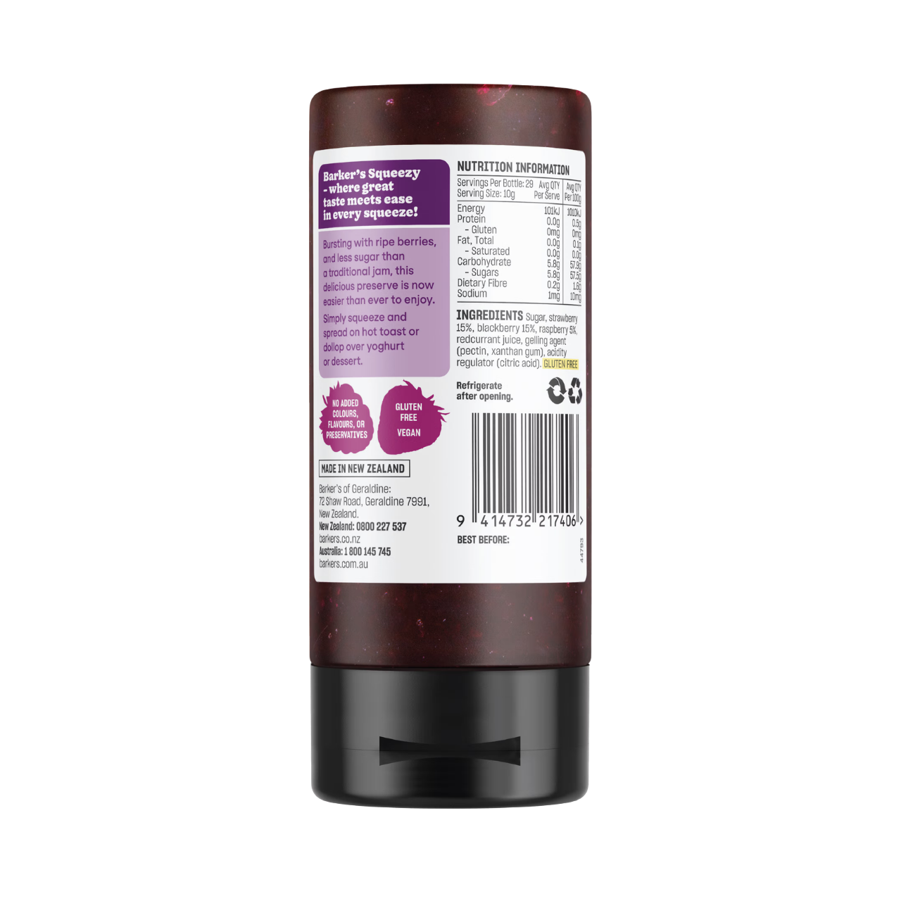Where great taste meets ease in every squeeze! Bursting with ripe flavoursome berries, and less sugar than a traditional jam, this delicious preserve is now easier than ever to enjoy. Simply squeeze and spread on hot toast or add a dollop to your favourite yoghurt or dessert.