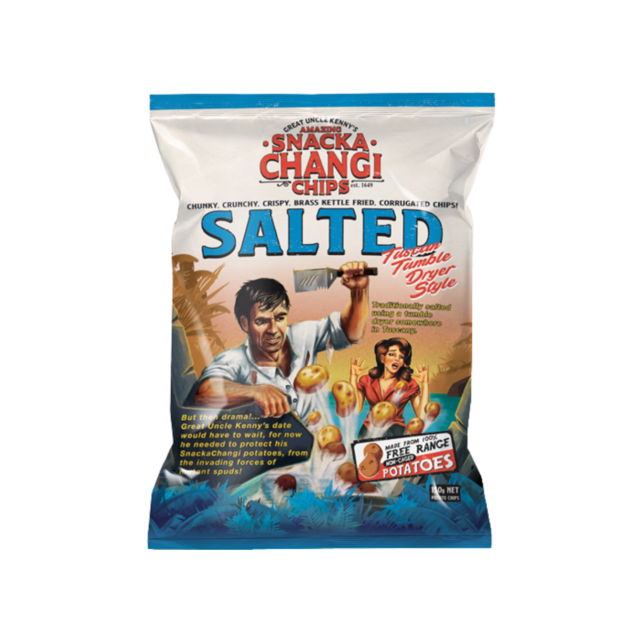 Great uncle Kenny's amazing snackachangi chips are chunky, crunchy, crispy, brass kettle fried corrugated potato chips, made with 100% free range non-caged potatoes. Traditionally salted in a tumble dryer by our seasoning expert 'big dave tuscan?.